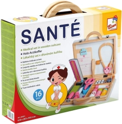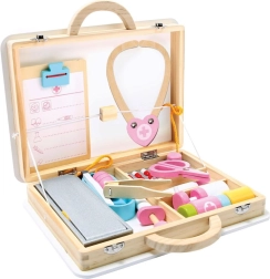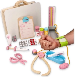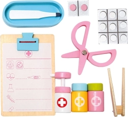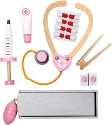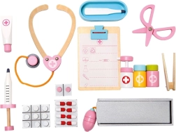 Set vsebuje lesene instrumente, kot so stetoskop, injekcijska brizga in druge pripomočke, ki podpirajo realistično igro.