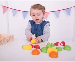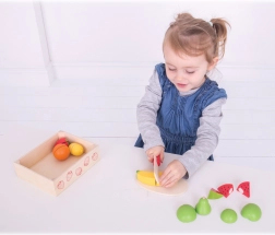 Ta skrbno izdelan komplet vsebuje priljubljene vrste sadja – jabolko, hruška, pomaranča, limona, jagoda, banana in lubenica – skupaj z lesenim nožem in rezalno desko. Posamezni plodovi so razdeljeni na dele, ki se pri 'rezanju' varno ločijo in ponovno spojijo. Kakovosten les, gladki robovi in trpežna izdelava zagotavljajo udobno in varno igro.