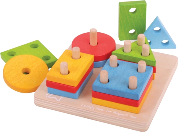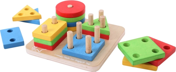 Ta lesena vstavljanka z osnovo z zatiči in pisano obarvanimi geometrijskimi oblikami (krogi, kvadrati, trikotniki, pravokotniki) otrokom ponuja veselje do odkrivanja in učenja. Pri natikanju posameznih kosov si otroci urijo prijem, koordinacijo oko–roka in logično razmišljanje, hkrati pa naravno vadijo razlikovanje barv in oblik ter prve korake v štetju.