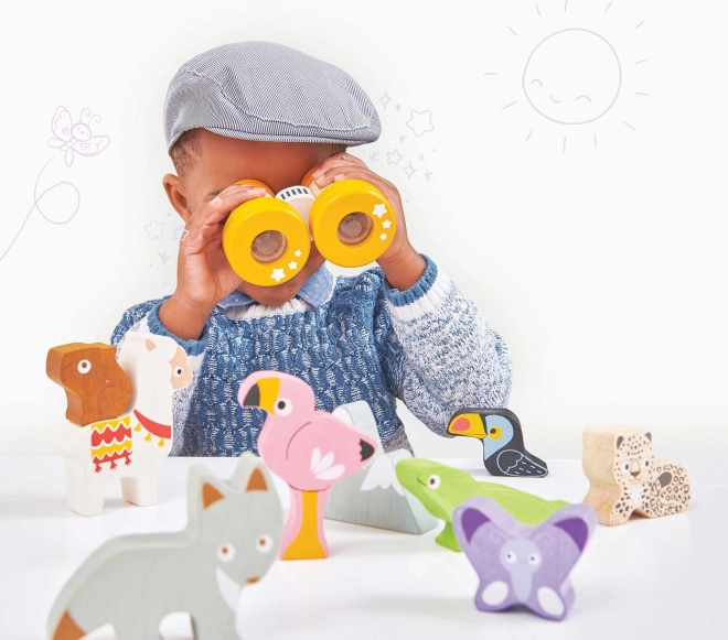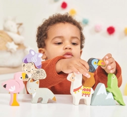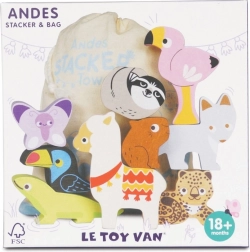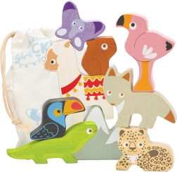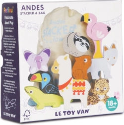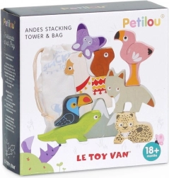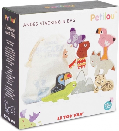 Ta andski sestavljivi stolp prinaša otrokom gorniško pustolovščino naravnost v otroško sobo. Set vsebuje robustne lesene figurice živali (npr. lama, flamingo, tukan, kuščar, metulj, lenivec) in kos gore, ki jih je mogoče zlagati, uravnavati in kombinirati v zabavne postavitve.