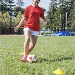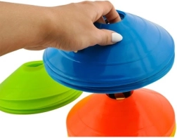 Set nizkoprofilnih trening stožcev je idealen za nogomet, atletiko, fitnes in šolski šport. Pet intenzivnih barv (rumena, oranžna, rdeča, zelena, modra) omogoča jasno označevanje con, poti in vadbenih postaj, kar povečuje varnost in preglednost treninga.