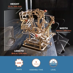 Ta dodelana kroglična steza iz kakovostne vezane plošče ponuja kombinacijo modelarskega užitka, izobraževalne vrednosti in sproščujočega doživetja. Ročno poganjan verižni dvig tekoče dostavlja kroglice na start, od koder se podajo skozi tri ločene odseke, vsak z edinstveno glavno oviro. Odprta zasnova poudarja funkcionalno mehaniko in fine detajle.