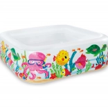 Napihljiv bazen, navdihnjen s podvodnim svetom, je idealen dodatek za poletne dni. Izdelan je iz visokokakovostnega vinila debeline 0,28 mm, kar zagotavlja njegovo trpežnost in dolgo življenjsko dobo. Zahvaljujoč priloženemu kompletu za popravilo je pripravljen na nepričakovane situacije.