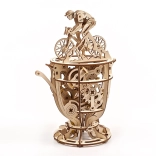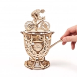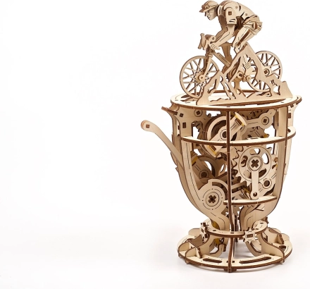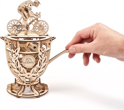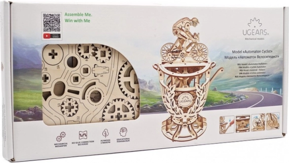 Mehanski model UGEARS Kolesar združuje tradicionalen les in pametno mehaniko. Gradbeni komplet v obliki trofeje s kolesarjem ponuja gladko delovanje zobnikov, ročno upravljanje z ročico in možnost natančnega uravnavanja vztrajnika s kovanci ali žetoni. Odlična izbira za ljubitelje konstrukcijskih izzivov, oblikovanja in tehnike.