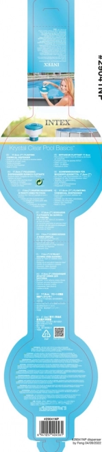 Plavajoči razpršilnik Intex prosto plava na površini vode, njegova velika zasnova zagotavlja vidljivost in varnost. Izdelan je iz trpežnega polipropilena in je opremljen z varnim pokrovom, ki sprejme klorove ali bromove tablete z največjo velikostjo 7,5 cm.