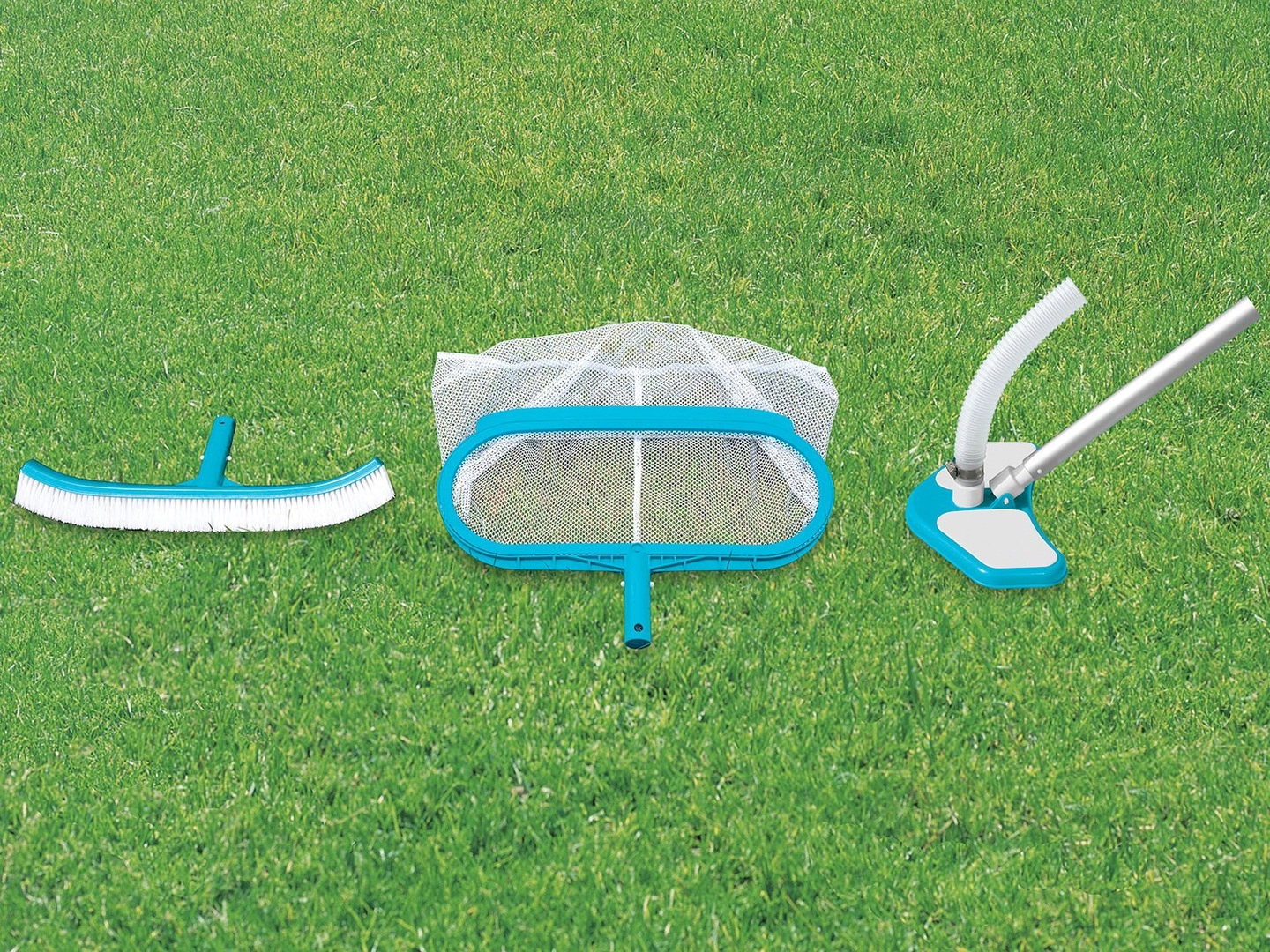 Set vsebuje mrežico, sesalnik in krtačo, ki pokrivajo vse potrebe čiščenja bazena.