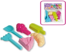 Praktičen set vsebuje lopatko in grabljice za enostavno zajemanje in oblikovanje peska ter štiri modelčke v obliki priljubljenih slaščic. Vzdržljiv plast se zlahka čisti in je idealen za igrišče, vrt ali plažo.