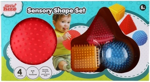 Senzorični komplet geometrijskih oblik LITTLE HERO bo navdušil vsakega radovednega otroka. Raznolike površine in izrazite barve spodbujajo čutno zaznavanje, medtem ko bodičasta struktura olajša prijem tudi najmanjšim ročicam. Pri rokovanju s posameznimi oblikami otroci naravno vadijo koordinacijo roka–oko in se učijo prepoznavati razlike med oblikami in barvami.