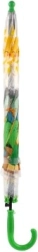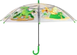 Vesel otroški dežnik s prozorno streho in barvnimi motivi dinozavrov spremeni deževne dni v zabavo. Zahvaljujoč avtomatskemu odpiranju, lahki konstrukciji in udobnemu zelenemu ročaju je enostaven za uporabo in odlično sede v otroško roko.