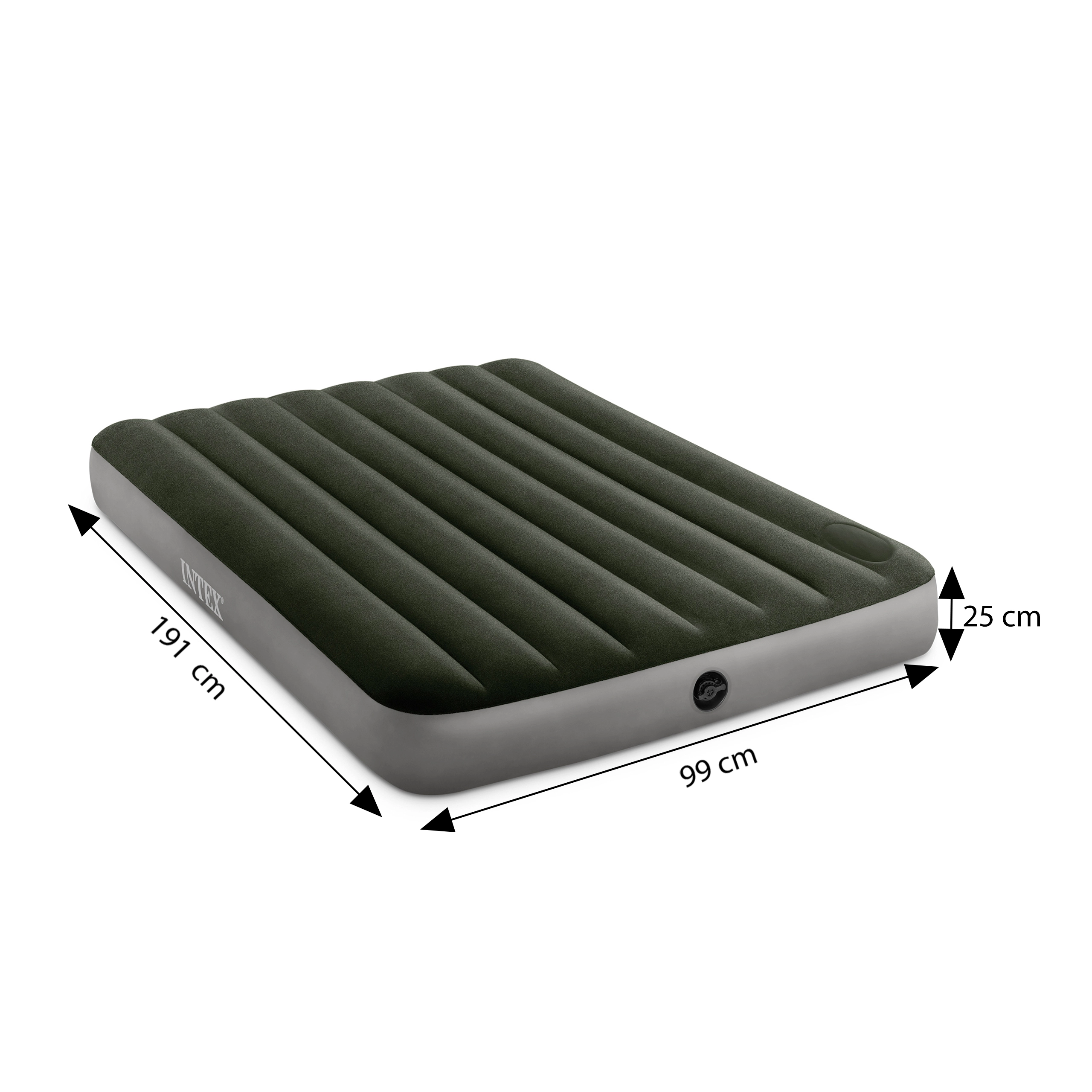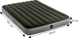 Mere 191 × 99 × 25 cm nudijo udoben prostor za eno odraslo osebo. Kakovosten PVC je enostaven za vzdrževanje, vodoodporni flok pa povečuje udobje in življenjsko dobo. Del pakiranja je tudi obliž za hitra popravila.