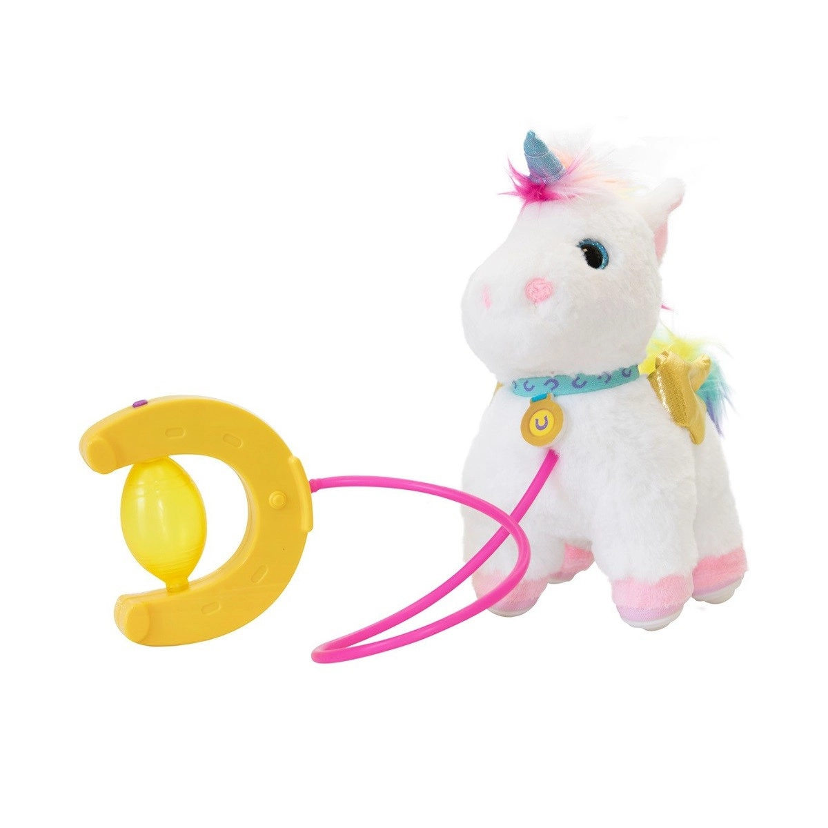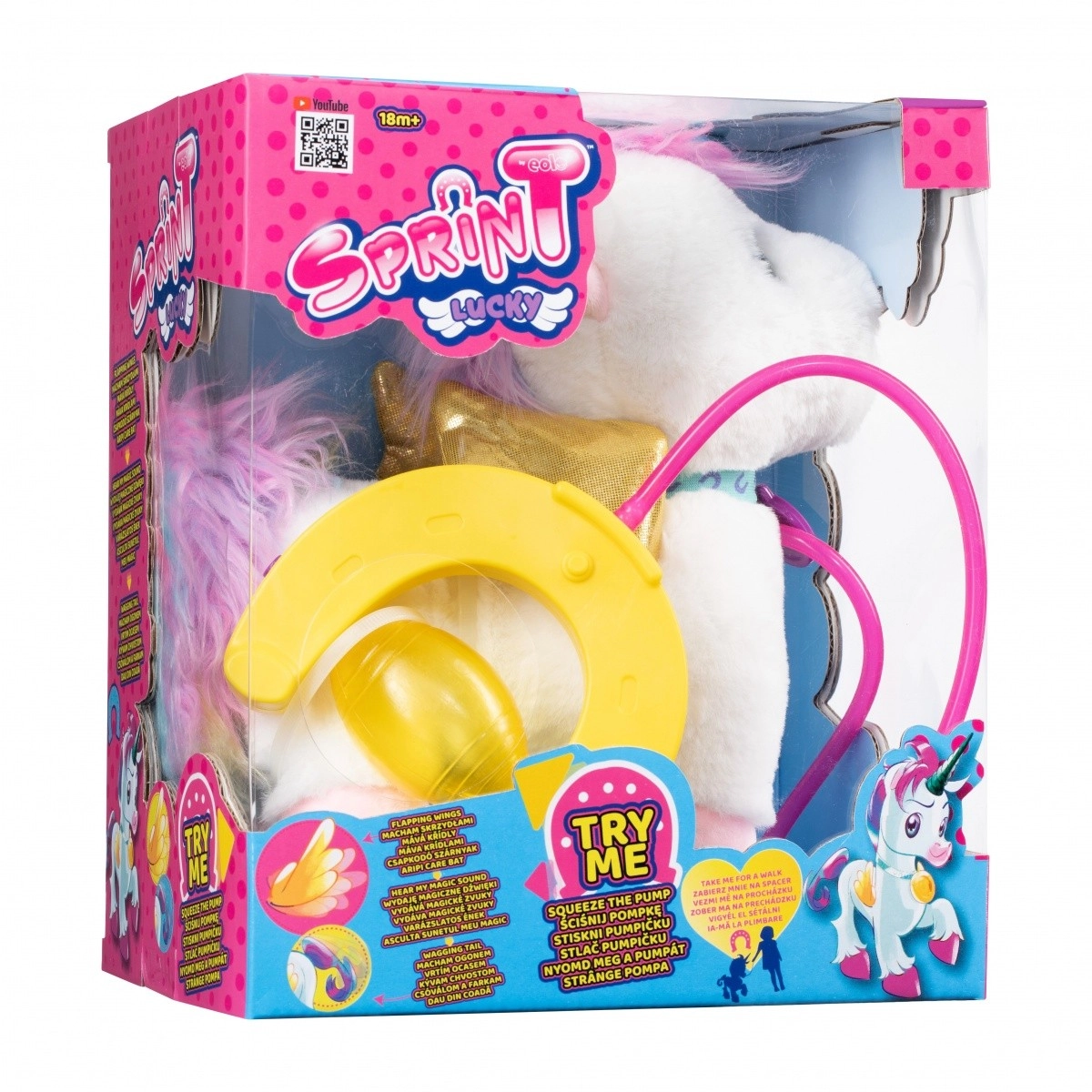 Prisrčni interaktivni samorog Lucky bo razveselil vsakega otroka – dovolj je, da vzamete povodec in plišasta igrača bo šla za vami. Ima stabilne tačke s posebnimi kroglicami za zanesljivo stanje tudi pri igri mlajših otrok. V povodcu je vgrajena zračna ročna črpalka, ki napihne ušesa in rep, z gibanjem aktiviran zvočni čip pa doda igri še več zabave.