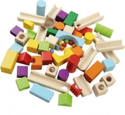 Set barvnih lesenih blokov in stez omogoča neskončne možnosti pri gradnji steze, medtem ko razvija fino motoriko in kreativnost.