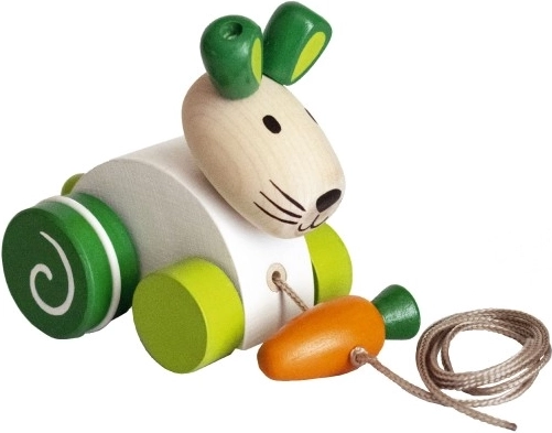Ta leseni vlečni zajček motivira otroke k hoji in aktivnemu gibanju. Zahvaljujoč gladki obdelavi in robustni konstrukciji je igrača varna in prijetna na dotik. Korenček, pritrjen na vrvico, doda igranju zabaven element in spodbuja otroško domišljijo.
