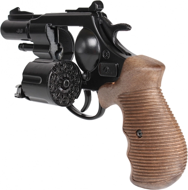 Odkrijte zabavo s policijskim revolverjem iz kolekcije Gold Collection. Ta model v elegantni črni barvi združuje trdno kovinsko ohišje, udoben ročaj in realistične podrobnosti, vključno z vrtečim se valjem. Namenjen je za kapsle (12 strelov), ki ustvarijo avtentičen zvočni učinek, hkrati pa ohranjajo varnost igre.
