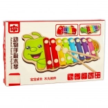 Paket vsebuje: lesene ksilofončke v obliki krokodila, 2 leseni palčki, kartico z enostavnimi “prijemi” za igranje.