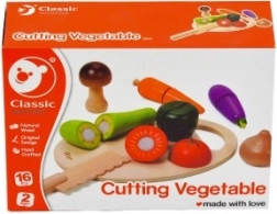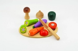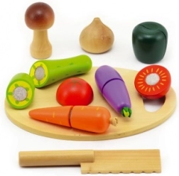 Ta lesena garnitura za rezanje je popolna igrača za male kuharje. Vsebuje 16 realističnih kosov zelenjave, ki jih lahko otroci režejo s pomočjo lesenega noža in deske.