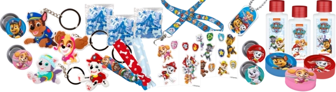 - 3 naglavni trakovi, 1 obesek za ključe, 4 priponke, 4 značke, 4 pasje tablice, 1 mleko za telo, 1 gel za prhanje, 2 kompleta nalepk, 3 paketki konfeta, 3 šumeče kroglice