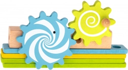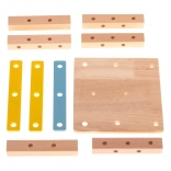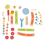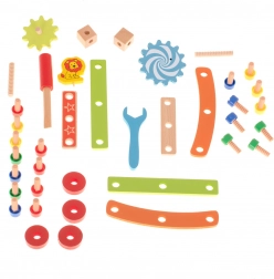 V kompletu sta lesen izvijač in ključ, zato imajo mali graditelji vse, kar potrebujejo. Pisani deli z igrivimi motivi (npr. levček in zobniki) spodbujajo ustvarjalno igro in učenje prepoznavanja barv. Odlična izbira za izobraževalno igračo in darilo, ki zabava ure in ure.