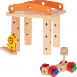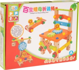 Ta kakovosten leseni komplet omogoča otrokom, da sestavijo delavni stolček in druge izvirne modele. Z vijaki, maticami in zobniki otroci raziskujejo principe preproste mehanike ter urijo zbranost in spretnost. Stolček je stabilen in zaradi premišljenega sistema odprtin ter spojev ponuja veliko kombinacij.