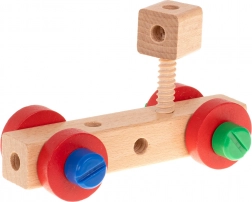 Vključeni so lesen izvijač, ključ, vijaki in matice – otroci se učijo pravilno povezovati dele in razvijajo fino motoriko.