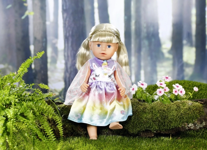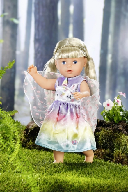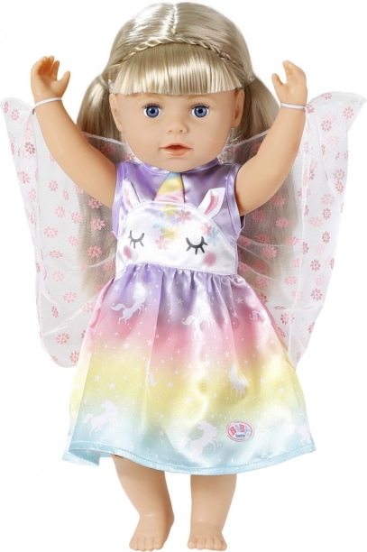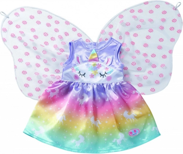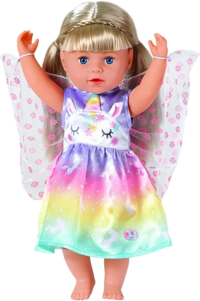 Vile in samorogi sodijo skupaj kot mleko in piškoti. Vilinska oblekica za lutko BABY born je sešita iz čudovite mavrične tkanine. Krilce je potiskano z očarljivimi samorogi, ki plešejo po zvezdnatem nebu. Zgornji del oblekice je spredaj okrašen z obrazom samoroga z našitimi ušeski in barvnim rogom. Prava vila mora imeti seveda tudi krilca. Prosojna krilca s svetlečimi rožicami so všita v zadnji del oblekice in se odprejo, takoj ko BABY born potisne roko skozi majhno zanko v zgornjem delu krilc. Originalna oblačilna oprema za lutke BABY born. Za domiselno, raznoliko in dolgotrajno igro. BABY born Pravljični kostum Samorog za lutke velikosti 43 cm. Priložena je obešalnica.