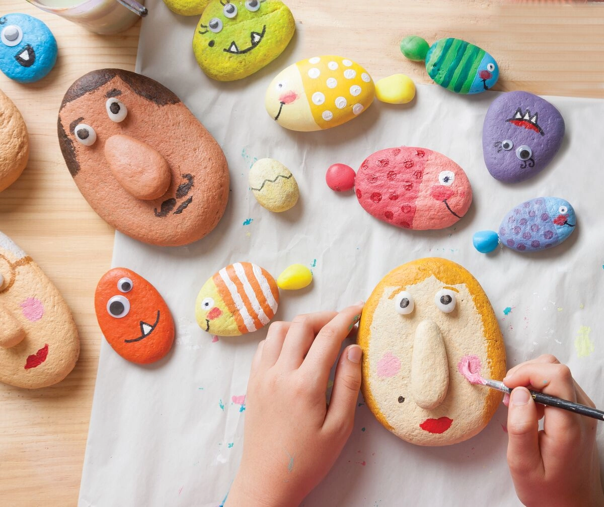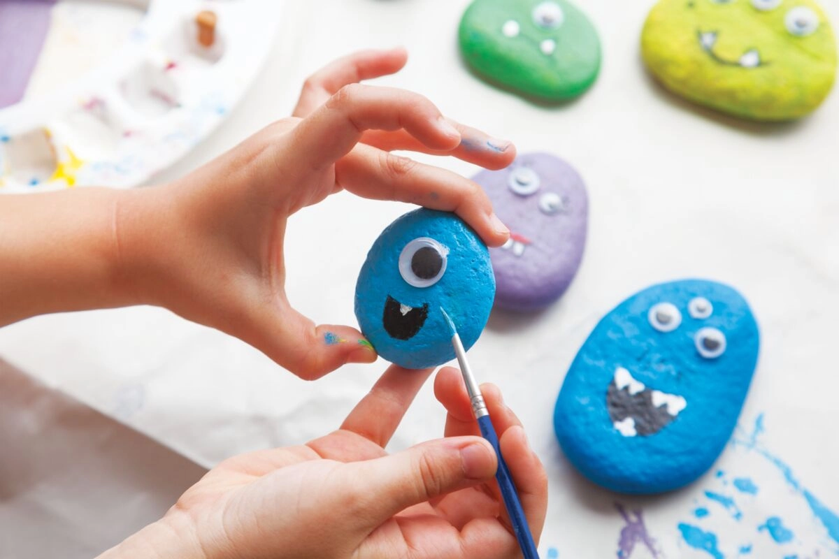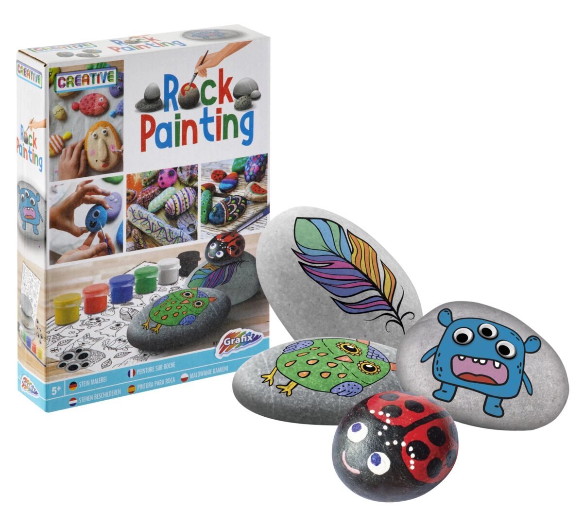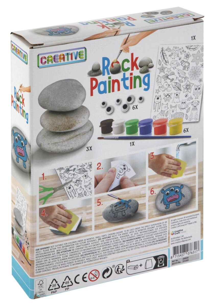 Komplet vsebuje vse, kar otroci potrebujejo: gladke prodnike, 6 barv, čopič, nalepke in premikajoča se očesca. Odprite škatlico in začnite ustvarjati brez dodatnih nakupov.