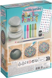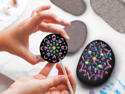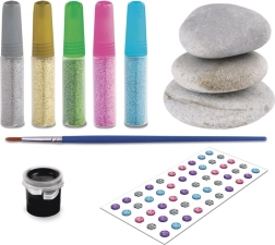 Vsebina kompleta je zasnovana tako, da je primerna za začetnike in male umetnike. Gladki kamni lepo sedejo v roko, čopič omogoča natančno delo, kovinska paleta (modra, rožnata, zelena, srebrna in zlata) pa doda vsakemu motivu pridih razkošja. Ustvarjalnosti ni meja – od mandal in obrazkov do lastnih ornamentov.