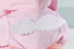 Naj vaša Baby Annabell doživi čarobne trenutke s tem stilskim kopalnim plaščem in pižamico. Plašč je okrašen s krilci, ki ga naredijo ne le modnega, temveč tudi udoben dodatek za igro. Pod plaščem punčka nosi kratek pajac z motivom ovčke, ki uživa v mavričnem prhanju. Da bodo nogice punčke lepo na toplem, komplet vključuje tudi rožnate nogavičke s podobami krilc.