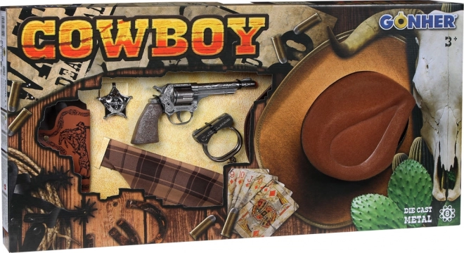 S tem setom dobite vse, kar potrebujete za popolno kavbojsko izkušnjo: klobuk, torbico za revolver, ruto, lisice, šerifovo značko in eleganten srebrn revolver.