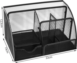 Ta praktični organizator pomaga urediti vse vaše pisarniške potrebščine in ohraniti delovno površino pregledno. Robustna konstrukcija iz kovine (železa) z mrežastim dizajnom je trpežna in vzdržljiva, zato prenese vsakodnevno uporabo doma in v službi. Zaradi kompaktnih mer se prilega vsaki mizi, hkrati pa je presenetljivo prostoren.