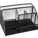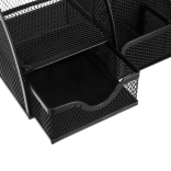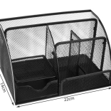 Ohranite red na pisalni mizi s kompaktnim in vzdržljivim namiznim organizatorjem iz kovinske mrežice v elegantni črni barvi. Ponuja 6 predelkov, praktičen izvlečni predal in premišljeno razporeditev za svinčnike, označevalnike, lepljive lističe, sponke in škarje – idealno za pisarno, domačo delovno sobo in za študij.