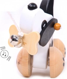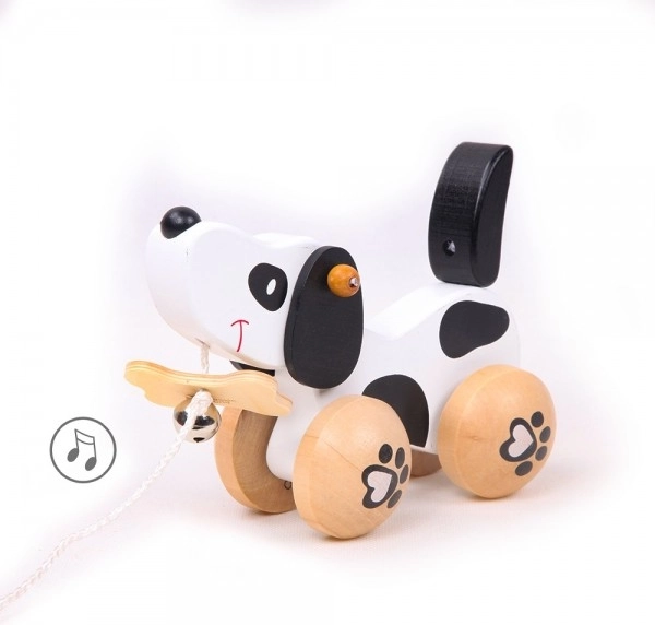 Kužek je na kolesih z motivom tačk, njegov rep pa se ob gibanju vrti, kar dodaja k njegovi igrivosti. Zabavo okrepi zvonček, ki spodbuja slušno zaznavanje otrok. Opremljen je z vrvico, ki je pritrjena k kosti v gobcu, kar omogoča enostavno vlečenje. Igrača je primerna tako za igro doma kot zunaj.