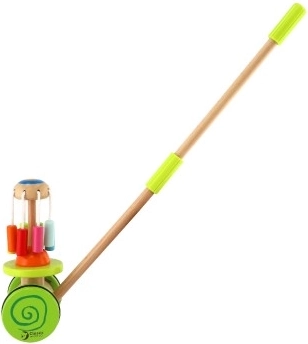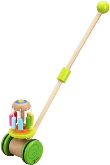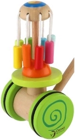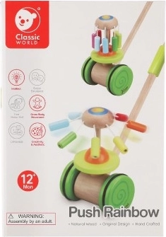 Leseni barviti potisni voziček Classic World je idealna igrača za male raziskovalce, ki se učijo hoditi. Voziček je opremljen z barvitim vrtiljakom, ki se vrti in oddaja prijetne zvoke, ki pritegnejo otrokovo pozornost ter podpirajo njegovo hojo.
