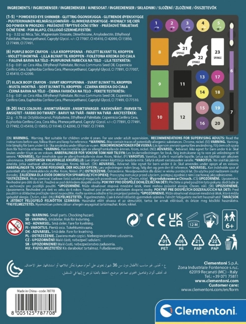 S tem setom za poslikavo obraza znamke Clementoni bodo otroci uživali v zabavi in razvijali svojo ustvarjalnost. Odprite škatlico in čaka vas pregledno urejena paleta z vsemi potrebščinami za varno in igrivo ličenje.
