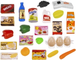Del kompleta so barvito sadje in zelenjava, pijače, sladkarije, jajca in škatlice z živili. Realistični dodatki podpirajo učenje skozi igro, prepoznavanje živil in razvrščanje. Stabilna plastična izvedba je vzdržljiva in varna za vsakodnevno igranje.