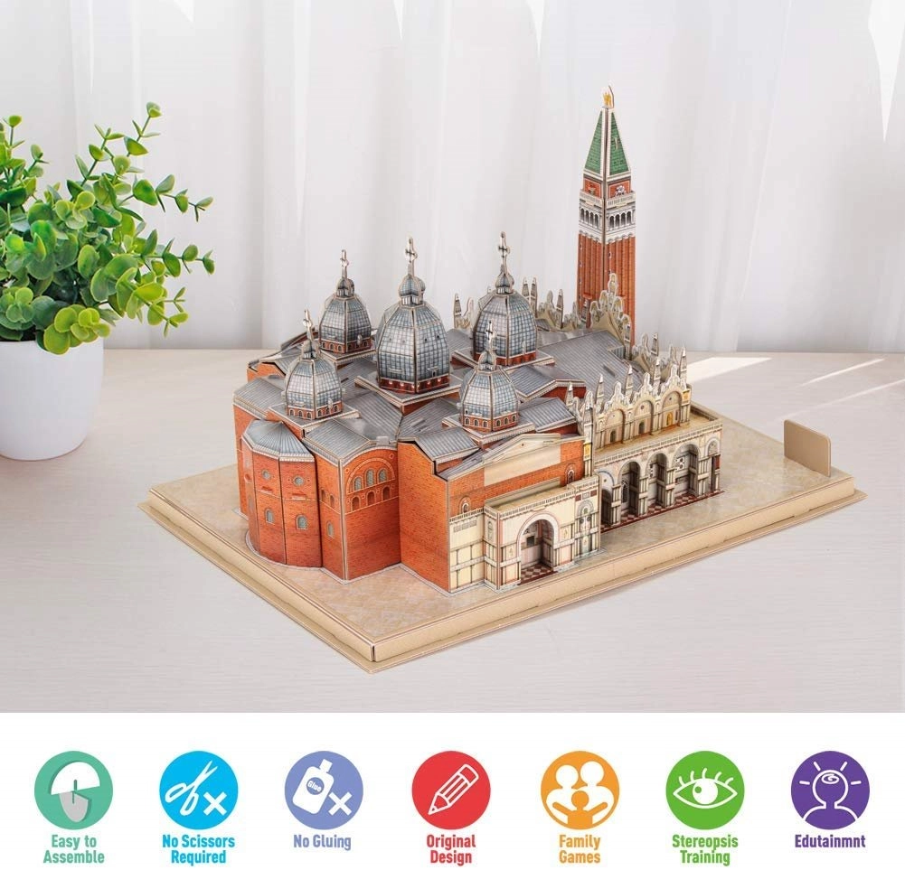Odkrijte čar Benetk z dovršeno sestavljanko Trg svetega Marka. 3D sestavljanka CUBICFUN iz izdaje National Geographic je izdelana iz posebne večplastne pene, prevlečene z laminiranim potiskanim papirjem, ki zagotavlja lepe barve in dolgo življenjsko dobo. Deli so predrezani – preprosto jih izlomite in po navodilih sestavite.
