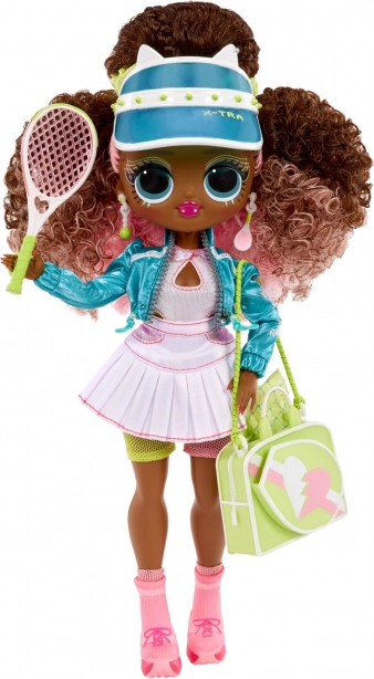 Punčka, oblečena v barvit teniški outfit s šiltom, loparjem in športno torbo, popolno združuje modo in igro.