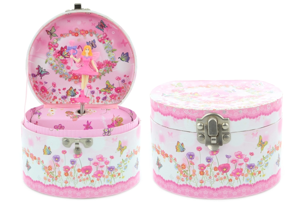 Očarljiva glasbena škatlica za nakit z vilo je popoln dodatek otroški sobi. Po preprostem navijanju ključka se vila v škatlici zavrti in zazveni nežna melodija, ki ustvari pravljično vzdušje. Kompaktna velikost se lepo prilega na polico ali nočno omarico ter nudi dovolj prostora za droben nakit ali skrivne zaklade.