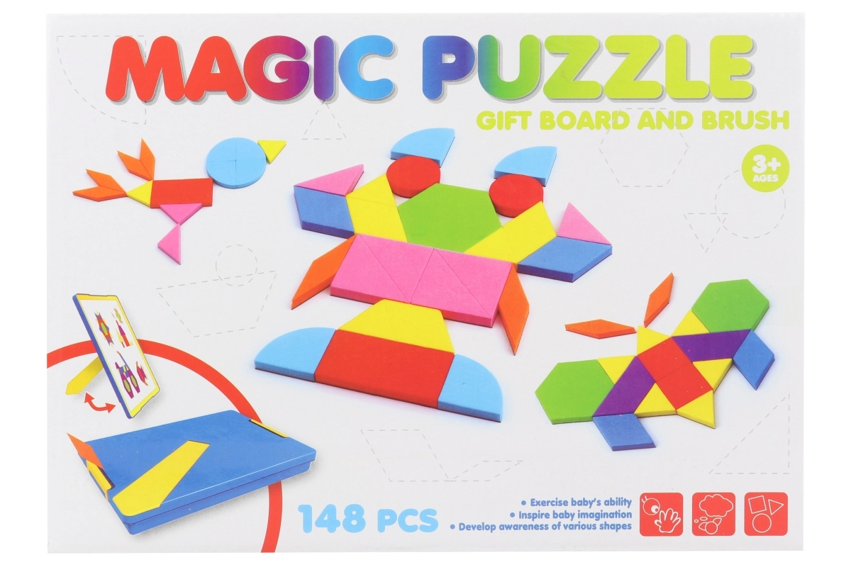 Ta bogat komplet magnetnih tangramov prinaša ure ustvarjalne igre in učenja. Zaradi magnetne plasti se koščki dobro oprimejo magnetnih tabel ali hladilnika, medtem ko je penasti material lahek, prijeten na dotik in varen za majhne roke. Kompaktna plastična škatlica ohranja vse koščke skupaj in olajša prenašanje.