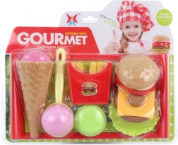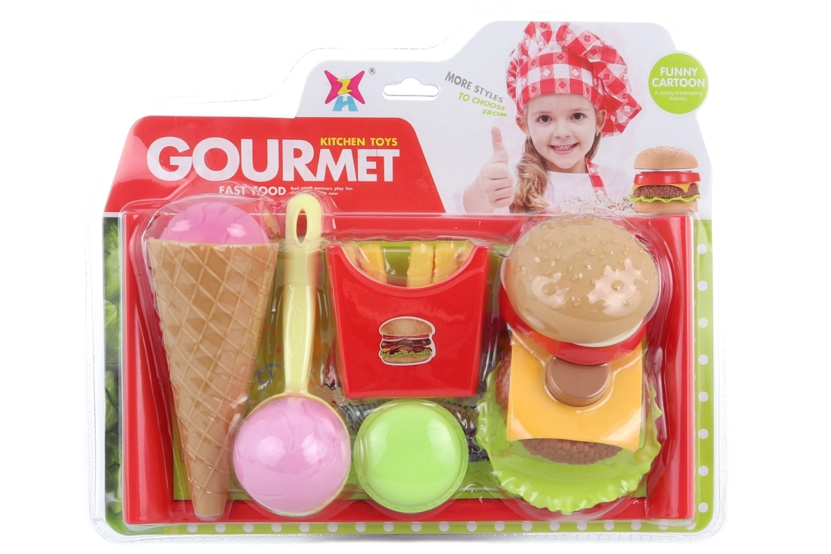 Ta barvit set hrane je odličen dodatek k otroški kuhinji. Otroci lahko pripravijo burger po svojih željah, zajemajo sladoled z zajemalko in vse postrežejo na priloženem pladnju. Realistične podrobnosti spodbujajo posnemanje pravega kuhanja in strežbe.