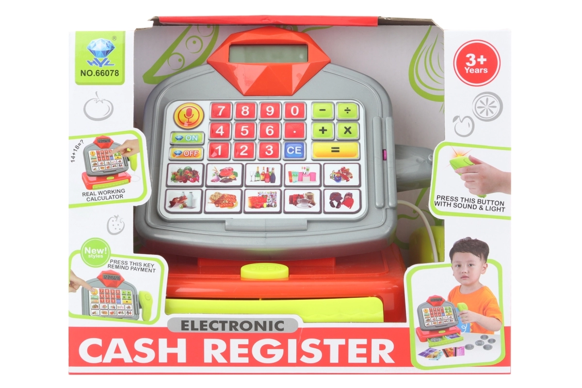 Plastična elektronska blagajna na baterije. Blagajna ima izvlečni predal za denar, čitalnik kartic in skener črtnih kod. Blagajna oddaja zvoke, sveti in zna računati. Priložen je tudi denar. Napajanje na 3 baterije AA (niso priložene). Dimenzije blagajne približno 17,5 × 19 × 12,5 cm. Dimenzije embalaže približno 27 × 21,5 × 14 cm. Starost 3+.