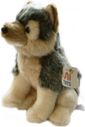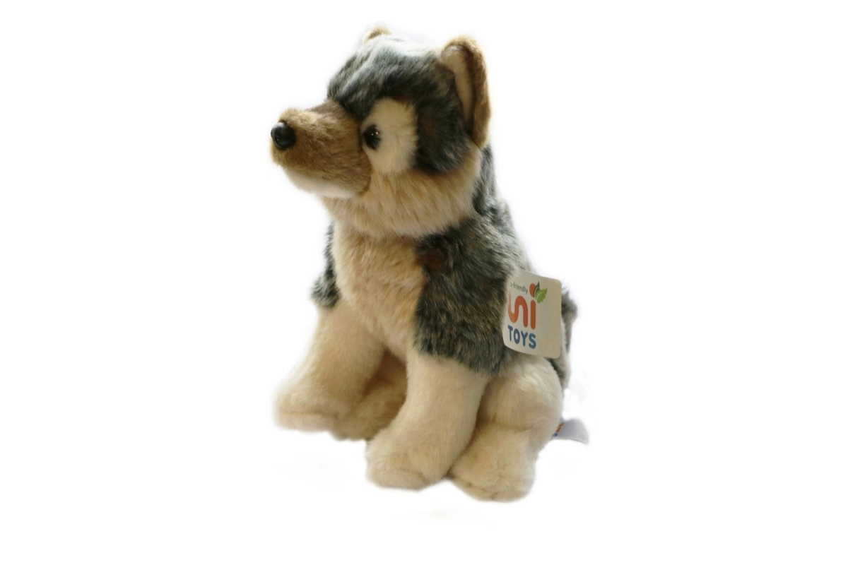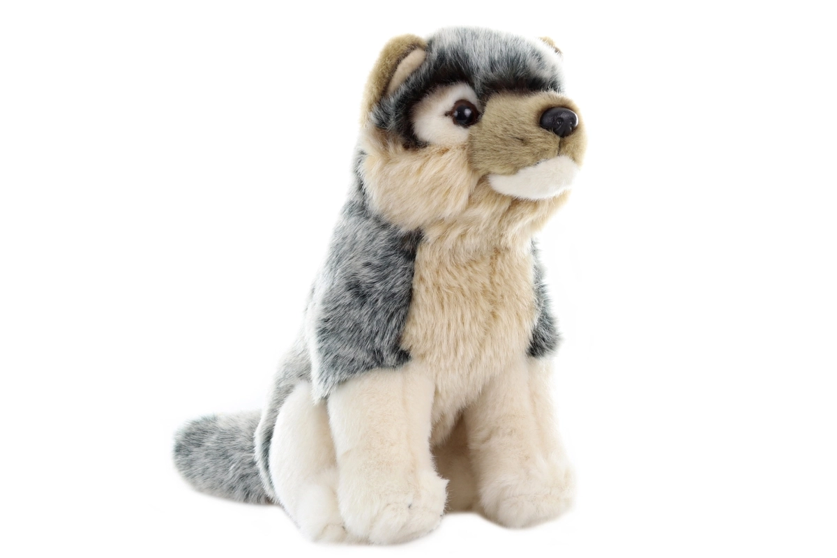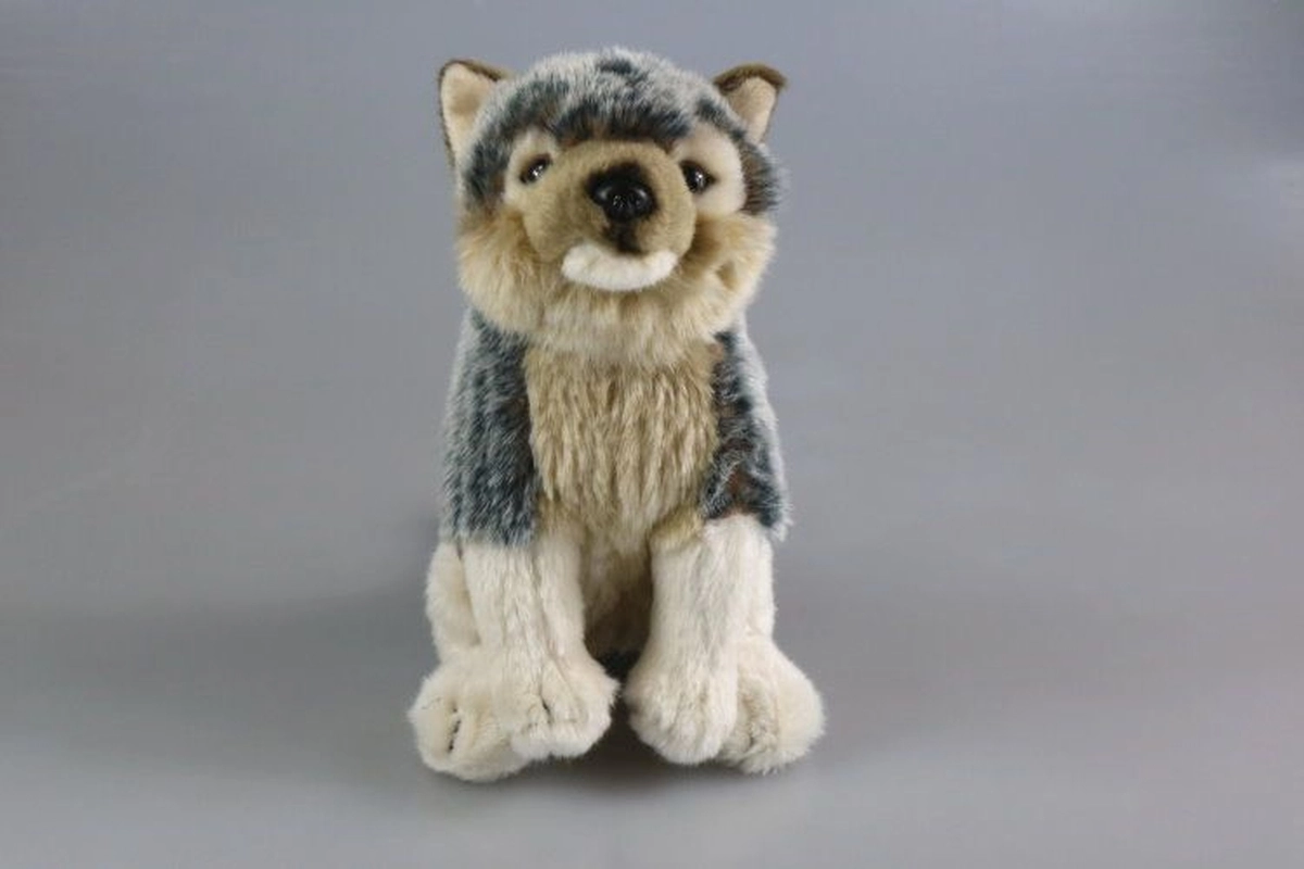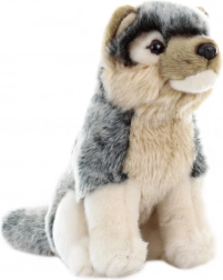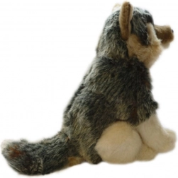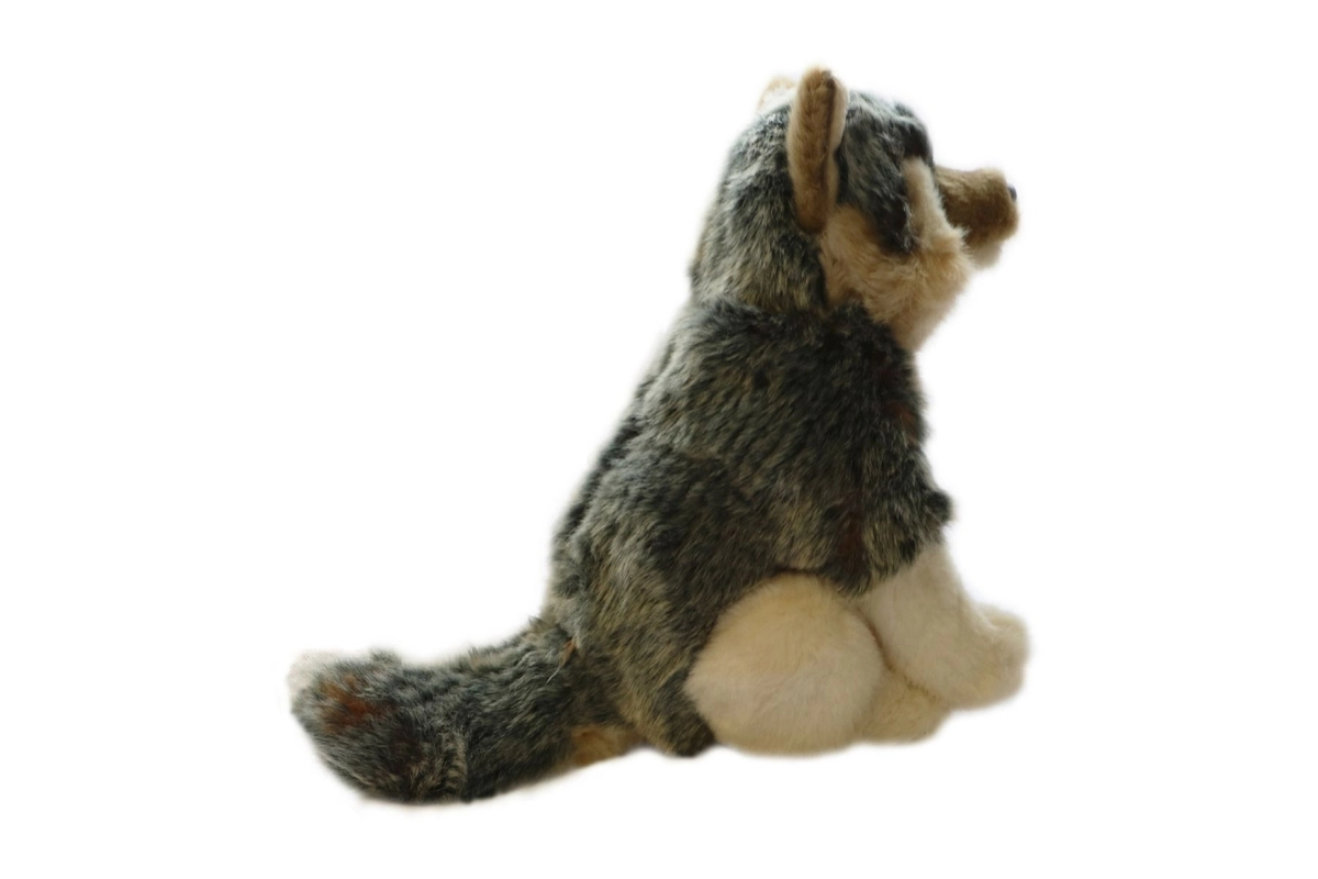 Plišasti sedeči volk velikosti približno 20 × 24 × 11 cm (brez repa). Dolžina repa približno 9 cm. Starost 0+