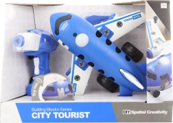 Letalo v modro-beli barvni kombinaciji je narejeno iz trpežne plastike in ima realistične podrobnosti, kot so okenca, podvozje in krila. Paket vsebuje izvijač in otroški vrtalnik, ki služita tako za montažo kot tudi kot pogonski modul. Sestavljen model meri približno 26 × 25 × 14 cm, kar je idealno za otroške roke.