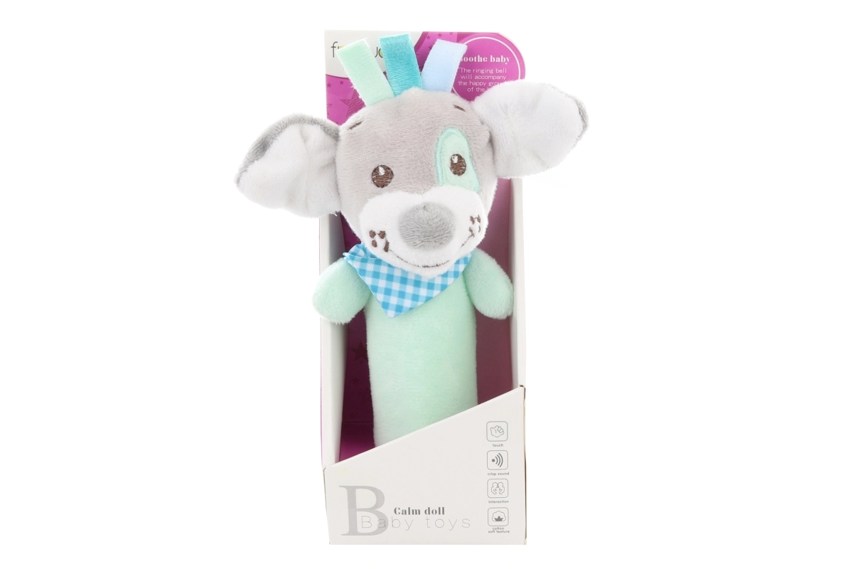 Ta mehka plišasta ropotuljica z zelenim kužkom je idealna prva igrača za novorojenčke. Zahvaljujoč piskanju in rožečemu zvoku spodbuja sluh, medtem ko izrazite barve in kontrasti podpirajo vidno zaznavanje. Ergonomična oblika olajša držanje z malimi rokicami.