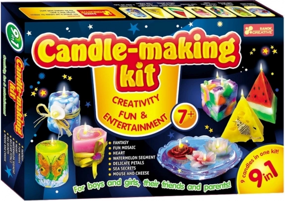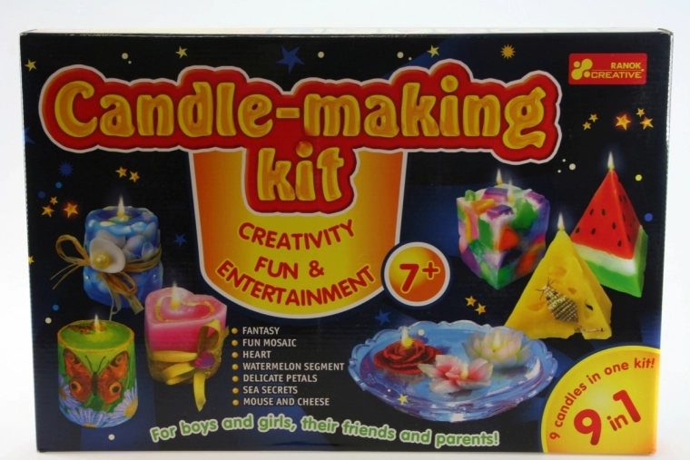 S tem velikim kompletom si lahko v udobju doma izdelate do 9 sveč. Različne barve in oblike sveč (srce, melona, morska, plavajoča, sir in miš, mozaik itd.). Paket vsebuje vse potrebno za izdelavo (parafin, vlivne forme, barvilo, stenja, akrilne barve, lepilo, bleščice, steklene perle, satenaste trakove itd.). Komplet vsebuje npr. voščen osnovni material, šablone, lončke, modelčke, žičko, perle, školjkice, okrasni prtiček, barve, trak, lepilo, vrvico, voščenke in še mnogo drugega. Dimenzije embalaže 30 x 44 x 6 cm. Starost 7+. IZDELANO V EVROPI