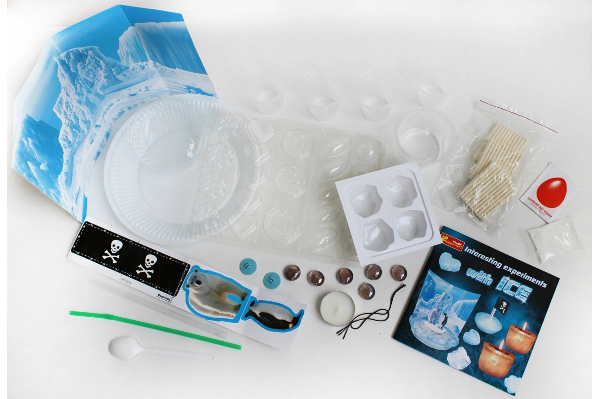 Paket vključuje pester izbor orodij in materialov: modelčke za led, plastelin, svečko, kamenčke, lončke, slamico, živilsko barvilo, šablone, nit in druge pripomočke. Priložena so tudi jasna češka navodila korak za korakom, zato se lahko otroci lotijo eksperimentiranja skoraj takoj.