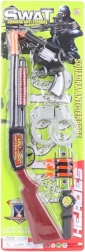 Komplet orožja za otroke vsebuje puško, revolver, lisice, uro in tri naboje s priseskom, idealno za igro in razvoj otroške domišljije.