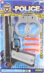 Policijski komplet vsebuje pištolo, lisice in 3 naboje s priseskom. Velikost pakiranja približno 31,5 × 19 × 3 cm. Starost 3+