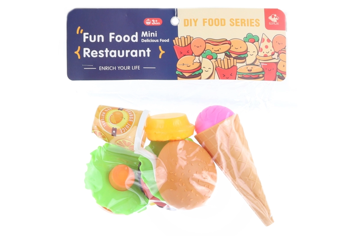 Ta igriv komplet plastičnih živil je popoln dodatek za otroško kuhinjico. Otroci si lahko pripravijo svoj hamburger, ponudijo sladoled, se posladkajo s pito in k temu postrežejo pijačo. Deli so lahki in varni za majhne roke.