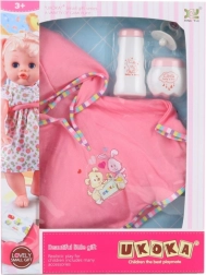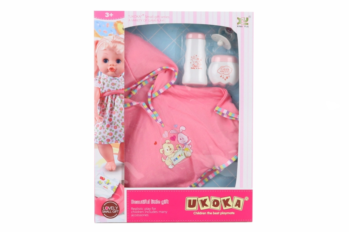 Ta univerzalen komplet dodatkov za punčko velikosti 45 cm je odličen dodatek vsaki otroški zbirki. S pončem, dudo in stekleničkami se lahko otroci igrajo nego dojenčka in razvijajo svojo domišljijo.